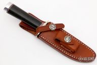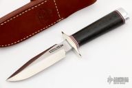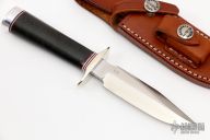 This is a miniature Model 1 - with all the features of the famous WWII full size Model 1. Stainless steel blade with top edge sharpened approximately 1 3/4 inches back from the tip, .168" blade stock and .828" blade depth, hidden tang construction. The handle has a nickel silver double guard, duralumin butt, and a black linen micarta grip with red/white/blue spacers. Comes with a brown leather sheath. In addition, the knife is authenticated by a coded transponder which cannot be altered. The transponder is inserted into the handle during construction with an encoded serial number matching the etched number on the blade. Only 1500 made. Serial number 634. Excellent condition.