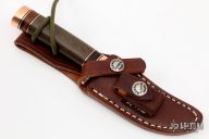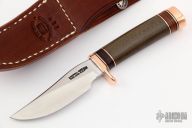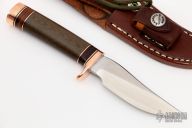 The miniature Model 27 debuted in Randall's 2012 75th anniversary catalog and is the first catalog miniature model. This knife has a 3.5" stainless steel blade, .156" blade stock and .984" blade depth, hidden tang construction. The handle has a copper guard and butt, green micarta grip, and black/copper/leather spacer pattern. Comes with a brown leather sheath. Excellent condition.