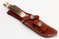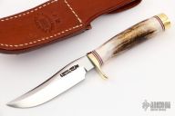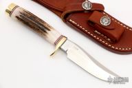 This Miniature Model 3 Hunter by Randall features a stainless steel blade with false top edge, .162" blade stock and .811" blade depth, hidden tang construction. The handle has a brass guard and butt, and stag grip with red/white/blue spacers. This knife is part of a limited edition and is numbered 938. Comes with a brown leather sheath. Excellent condition.