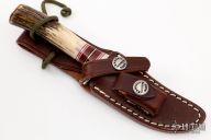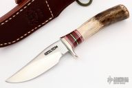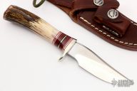 The miniature Model 27 debuted in Randall's 2012 75th anniversary catalog and is the first catalog miniature model. This knife has a satin finished stainless steel blade, .175" blade stock and .987" blade depth, hidden tang construction. The handle has a nickel silver guard and butt plate, and a stag handle with red, duralumin, white, red linen micarta, black and brass spacers. Comes with a brown leather sheath with miniature stone. Excellent condition.