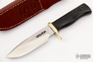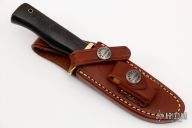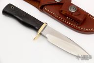 This Miniature model 28 features a satin finished drop point blade with notched thumbrest, .178" blade stock and .911" blade depth, full tang construction. The handle has a brass guard, black micarta grip and lanyard hole. Each miniature Randall model has a transponder in the handle matching the serial number of the knife, in this case "RKS 730/4334". Comes with brown leather sheath. Excellent condition.