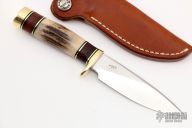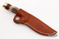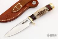 This is a RARE Model 25 Mini by Randall Made Knives, it is #889 of only 1500 made by Randall between 1996 and 1998. Identical to the standard Model 25 but scaled down. Has a drop point blade with false top edge, notched thumbrest, .171" blade stock and .862" blade depth, hidden tang construction. The handle has a brass guard and butt with a stacked leather and stag handle, black and brass spacers. Comes with brown leather sheath. Excellent condition.