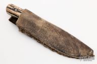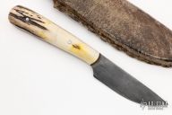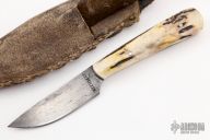 This utility from J.P. Miller features a Cable Damascus blade with .109" blade stock and .943" blade, full tapered tang construction. The handle has stag scales. Comes with a brown leather sheath. Excellent condition.