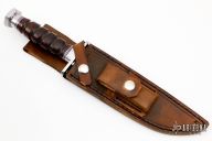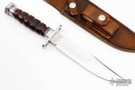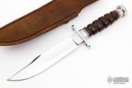 This Marble's Pattern by Steve Voorhis features a mirror polished clip point blade with saw teeth and a false top edge, .216" blade thickness and 1.288" blade depth, hidden tang construction. The handle has a stainless steel guard and butt cap, fluted stacked leather grip with black/aluminum/red spacers. Comes with a brown leather sheath. Has a few light scratches, otherwise excellent condition.