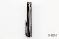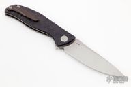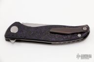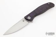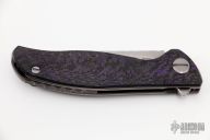 This F3 Flipper from Shirogorov has a tumble/polish finished flat ground spear point M390 blade with notched flipper. Handle has purple carbon fiber scales, tumbled titanium backspacer, tip up clip and liners. Recessed lanyard bail. Dead center blade seating, excellent detent and lockup. Multi Row Bearing System. Comes with original box and papers. Excellent condition.