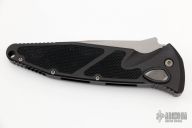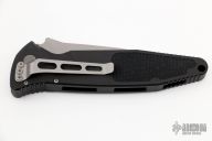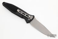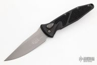 This Socom Elite automatic folder by Microtech Knives has a bead blasted blade with notched thumbramp. The handle is comprised of black aluminum with non-slip inlays, stainless steel clip positioned for tip down carry, and lanyard hole at the pommel. Serial number 1635 and dated 10/2000. Comes with a Microtech gold box and papers. Has a couple light scuffs, otherwise excellent condition.