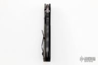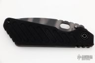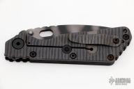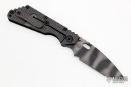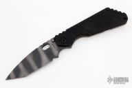 This Mick Strider SMF Fatty framelock folder features a tiger striped tanto blade with thumbhole and notched thumbrest. The handle has a black aluminum and flamed titanium frame with titanium clip, tip up carry. Jimping on blade spine. Nice lockup, detent, and blade seating. New condition.