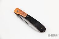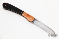 This Slipjoint by Chuck Gedraitis features a carbon steel wharncliffe blade with long pull. The handle has copper fluted bolsters and wood covers anodized titanium liners, and stainless steel. Has half-stop, flush in all positions. Has wear, patina, scratches, has been resharpened. Good user condition.