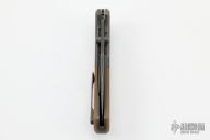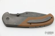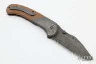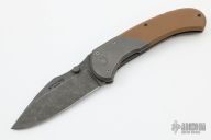 This Reaper folder from Eric Kramer features an acid tumbled blade with swedge and dual thumbstuds. The handle is made of tumbled titanium dovetailed bolsters, titanium liners, tan G-10 scales, tumbled titanium backspacer and titanium tip up clip. Blade is centered when closed and locks up with no play, nice detent. Excellent Condition. Comes with a zippered case.