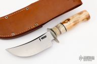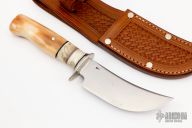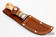 This skinner by Jim Behring of Treeman Knives features a satin finished convex ground blade, .179" blade stock and 1.419" blade depth, hidden tang construction. The handle has a nickel silver guard, fossil walrus ivory grip with Black/Musk ox/Red/White spacer pattern. Comes with a hand tooled MOSHER brown leather sheath. Has some light spotting on the blade, otherwise excellent condition.