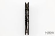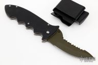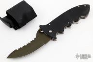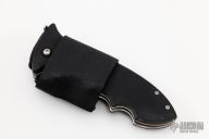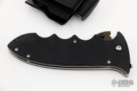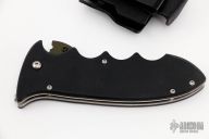 The R.E.K.A.T. Pocket Hobbit Warrior folder has an ATS-34 steel blade with a black coating. The primary cutting edge is plain and the swedge spine has serrations. Black G-10 scales with finger grooves and steel liners. Single thumb stud. Sliding lock release. Strange looking and intimidating. Comes with Kydex sheath. Excellent condition, has some light handling marks.