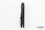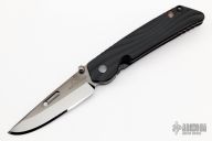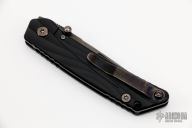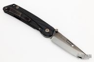 "The blade is convex on both sides in the tradition of the highly praised Japanese sword. This shape is both sharp and strong, and can still slice paper even after the 1,000 of hemp rope cuts. Using this blade form is one superb method of making an edge thick without losing of its sharpness. This is a knife of preeminent sharpness. You can enjoy its strong cutting capabilities for a long time. Even if used for rigorous cutting, the blade will not bite thanks to its convex shape. Other knives often will bite, and may nick if it is pulled out suddenly at that time. This knife scratches the plate of china. Please do not use it to cut food on the plate." The handle is sculpted black aluminum and tip up black stainless steel clip. Comes with original box and papers. #260 on blade. Excellent condition.
