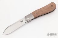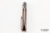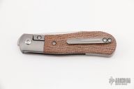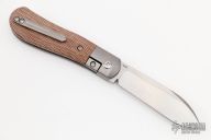 This Dogleg Front Flipper by Enrique Pena features a satin finished blade with a front flipper and notched thumbrest. The handle has titanium bolsters, brown micarta scales with a titanium backspacer and matching tip up pocket clip. Excellent Condition.