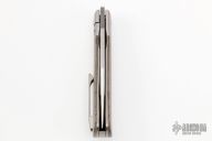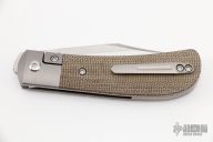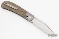 This Lanny's Clip Front Flipper by Enrique Pena features a satin finished blade with a front flipper and notched thumbrest. The handle has titanium bolsters, green canvas micarta scales with a titanium backspacer and matching tip up pocket clip.  Excellent Condition.