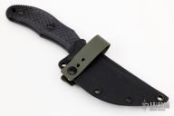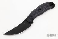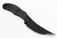 This Chopper by Bastinelli Knives features an upswept black blade with notched thumbrest and mortise tang construction.  .125" Blade Stock.  1.116" Blade Depth. The handle has black textured G10. Comes with kydex sheath with loop and a large hard case. Excellent condition.