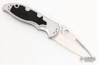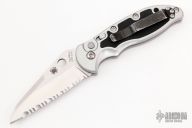 This C121S Embassy from Spyderco features a clip point style blade with swedge, serrated edge, small thumb hole and notched thumb ramp. The handle is comprised of an aluminum frame with black G10 inlays. Lanyard hole in pommel. Reversible black coated stainless steel tip up clip. Blade is deployed via push button with fast coil spring action. Sliding safety on "A" side of handle. Light marks on pocket clip and "B" side G10 inlay. Includes original box and papers. Has scuffs and scratches, chips in the blade, dings in the frame. Fair condition.