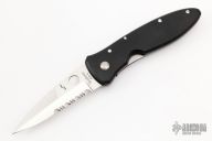 This C56PS from Spyderco features a drop point blade with, serrations, a false top edge, and spyderco thumb hole. The handle is comprised of micarta scales over stainless steel liners and backspacer. Tip down carry stainless steel pocket clip. Comes with original box. Has some light scratches on the blade and clip otherwise excellent condition.
