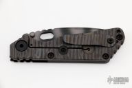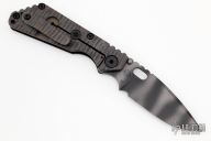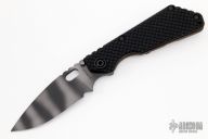 This SNG framelock folder by Mick Strider features a tiger striped blade and a dimple pattern black G-10 and flamed titanium frame and tip up titanium clip. Includes a "Lock Bar Stabilizer" for maximum reverse lock retention. Nice detent, lockup and blade seating. Excellent condition.