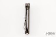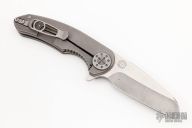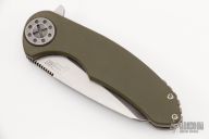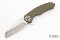 This F3 by Curtiss Knives features a stonewashed blade with notched thumbrest and flipper. The handle has a green G10 scale and stonewash finish titanium frame with matching titanium tip up pocket clip and hardware. Rides on bearings, nice detent and lockup. Has some scuffs and scratches, otherwise excellent condition.