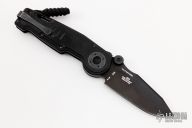This 0500 G&G Hawk design by Zero Tolerance features a black clip point blade with dual thumbstuds. Textured G-10 scales for maximum grip. Has a thumb button release for the blade. Makes a great "gun bolt" type sound when it locks up! Comes with nylon belt sheath. Has some scuffs and scratches, otherwise excellent condition.
