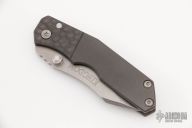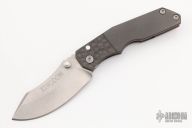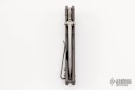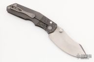 This mini Samaritan folder by Kingdom Armory is built out as an all titanium framelock with a stonewashed S30V blade. Both sides of the frame have a dragon skin textured pseudo bolster. The Ti deep ride pocket clip is very secure and recessed down into it’s own pocket milled into the frame. All hardware is stainless, with a sleeved style pivot, and bronze washers. Has some light scratches, otherwise excellent condition.