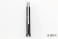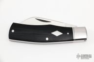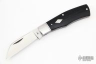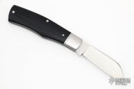 This slipjoint by Charlie Bell features a satin finished blade with nail nick. The handle has satin finished and threaded 416 stainless steel bolsters with integral liners, black micarta covers with stainless steel escutcheon, CPM154 spring. Has half-stop, flush in all positions. Includes a padded zippered case.  Light scratches are visible on the blade and handle otherwise the knife is in good condition.