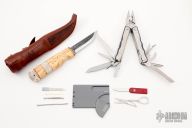 J Marttiini Finland fixed blade with scandi ground blade, .099" blade stock and .755" blade depth, hidden tang construction. The handle has a brass guard, curly birch grip with antler spacer and butt. Comes with a brown leather sheath. Good condition.