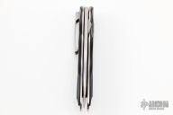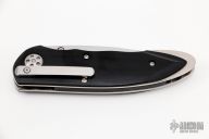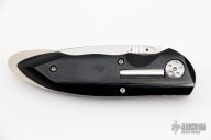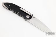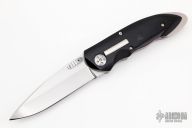 This Custom E-Lock folder by Allen Elishewitz eventually became a production model for CRKT, it features a hand rub satin finished blade with single thumbstud. The handle has a satin finished titanium frame with black G-10 overlays, polished edges, black G-10 backspacer, tip down satin stainless steel clip. Nice lockup and blade seating. Comes with black leather pouch. Excellent condition.