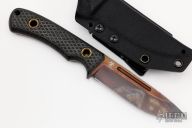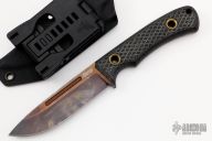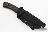 This K-1S fixed blade from TRC Knives has an apocalyptic finished drop point blade with fullers and notched thumbrest. 0.154" blade stock, 1.085" depth. Handle is comprised of sculpted black G-10 with lanyard hole over full tang construction. Includes kydex sheath with TekLok. Excellent condition.