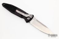 This Socom Elite Auto has a stonewash finished clip point blade with a partially serrated edge. Black aluminum handle with non-slip inserts. Stainless steel clip, tip down carry. Glass breaker. Dated 08/2018 and s/n 0589. Excellent condition. Comes with original box and papers.