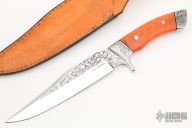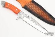This Fighter by MA Knives features a mirror polished blade with engraved flats and a false top edge, .171" blade stock and 1.457" blade depth, full tapered tang construction. The handle has engraved stainless steel guard and rear bolsters, orange metallic linen micarta scales with black spacers, engraved stainless steel pins and spine of tan. Comes with a hand tooled leather sheath and COA. New from maker.
