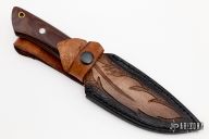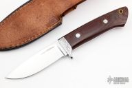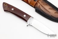 This Drop Point Hunter by MA Knives features a mirror polished blade with .166" blade stock and 1.103" blade depth, full tapered tang construction. The handle has engraved stainless steel guard, red canvas micarta scales with engraved stainless steel pins and a brass lanyard hole. Comes with a hand tooled leather sheath. New from maker.