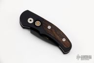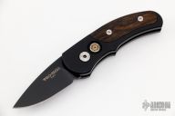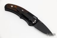 This is a Runt J4 "Jalapeno" by Pro-Tech features a black aluminum handle with cocobolo inlays and a black blade. Coil spring. California legal. Serial number 851 and PR11. Comes with Pro-Tech box. Excellent condition.