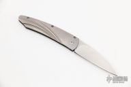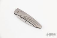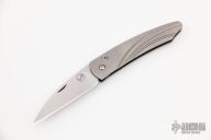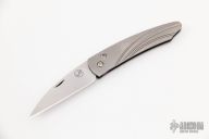 The Spryte is a discontinued button lock automatic model by William Henry Fine Knives. This Spryte is marked PROTO on the front of the frame near the blade. It features a hand rub satin finished blade with nail nick. The handle has a bead blasted titanium frame. Sapphire inset in push button with a gold bezel. Includes a William Henry box and sheath. Excellent condition.