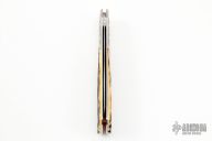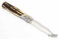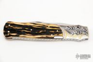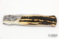 This Mid-Lock by W.D. Pease features a hand rub satin finished Kris blade with a single nail nick.  The handle has an engraved and gold inlaid 410 stainless steel bolsters engraved by Julie Warenski, beautiful stag scales, stainless steel liners and file worked lockbar/backspacer.  24K Gold inlay.  Comes with a zippered case. Excellent condition.