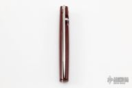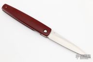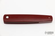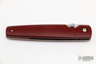 This Spike by the Late Phil Boguszewski features a hand rub satin finished blade with a single thumbstud. The handle has a red linen micarta frame with a jeweled titanium liner. Excellent condition. Nice detent, lockup, action and blade seating.