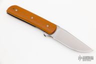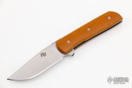 This Urban Trapper Shorty by Brad Zinker features a stonewashed blade with checkered thumbrest and flipper. The handle has micarta scales, tumbled titanium liners. Rides on bearings, nice detent, lockup and blade seating. Comes with zippered case.  Excellent Condition.