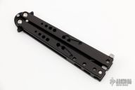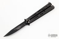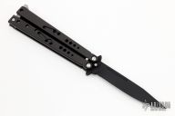 This Dragonfly balisong from Microtech Knives has a black blade and skeletonized black aluminum handles. Dated 12/2002 and #0913. Excellent condition. Hard to find. Comes with the original nylon sheath.