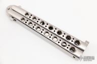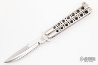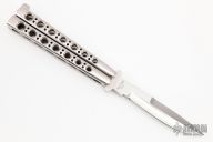 This early balisong from Pacific Cutlery features a Jody Samson ground satin finished blade with sharpened top edge. The handles are stainless steel with hole pattern. Has a couple light scratches, otherwise excellent condition. Includes original nylon sheath.