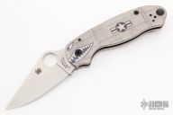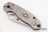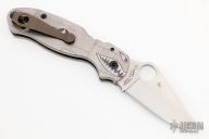 This C223GPDBL Para 3 by Spyderco features a satin finished clip point blade with thumb hole and notched thumbrest. The handle has MetonBoss titanium scales over nested steel liner and stand offs. The custom Lynch anodized titanium pocket clip is 4 way adjustable. Includes original box and paperwork for the knife and the clip. Has a couple of light scratches, otherwise excellent condition. Comes with original G-10 scales.