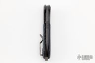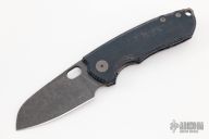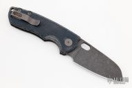 This F5.5 by Urban EDC Supply is a Vox Design. It features a dark tumble finished blade with thumbhole and notched thumbrest. The handle has blue denim micarta scales, blasted titanium liner, backspacer and tip up clip. Rides on bearings, nice detent, lockup and blade seating. Comes with original box and zippered case. Excellent condition.