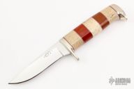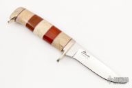 This Knife by D'Alton Holder features a mirror polished drop point blade with .125" blade thickness and .867" blade depth, hidden tang construction. The handle has a nickel silver guard and butt, amber and oosic grip with red and nickel silver spacers. Beautiful combination of materials and excellent workmanship. Comes with a brown leather sheath. Excellent condition. Made in 1990 and is #2 made for "KCC". Excellent condition.