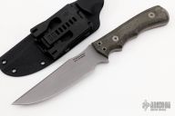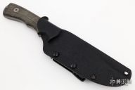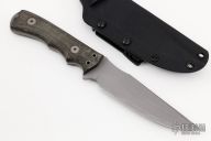 This Fighter by Ed Martin features a bead blast finished blade with a false top edge, .175" blade stock and 1.365" blade depth, full tang construction. The handle has black canvas micarta scales. Comes with a kydex sheath with TekLok. Has some sheath scratches, otherwise excellent condition.
