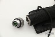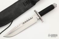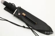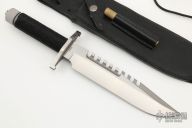 This Survival Bowie by Ed Martin features a satin finished clip point blade with a sharpened top edge, .281" blade stock and 1.731" blade depth, hidden tang construction. The handle has a stainless steel guard, hollow handle with cord wrap, and removable aluminum butt cap with o-ring and compass. Comes with a black leather sheath. Excellent condition.