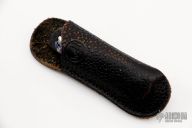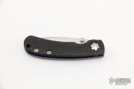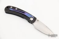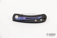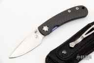This T09 Kestrel has a hand rub satin finished stainless steel spear point blade with single thumbstud. Handle is black carbon fiber with barrel spacers, lanyard hole, and purple anodized tip down titanium clip. Excellent action, lockup, and blade seating. Has a small spot on the blade and a couple light scratches, otherwise good condition. Comes with black leather pocket sheath.
