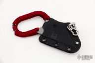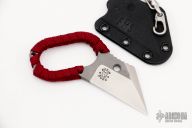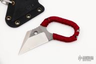 This Straight by Hideaway Knives features a satin finished wharncliffe blade with notched thumbrest and cord wrapped grip, .128" blade stock and 1.076" blade depth, full tang construction. Comes with a kydex neck sheath. Blade ground in 2004 by Tom Krein. Excellent condition.