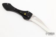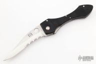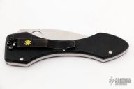 This Shabaria by Spyderco features a satin finished recurve partially serrated blade with thumbhole. The handle has black linen micarta scales, stainless liners, and a black stainless tip down clip. Has som scuffs/scratches, otherwise good condition.