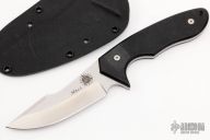 This knife by Jeff Hall is a Joel Pirela Design, it features a satin finished blade with false top edge, .123" blade stock and 1.195" blade depth, full tang construction with black G-10 scales. Comes with kydex sheath. #4on blade. Excellent condition.
