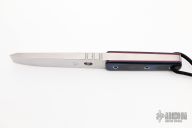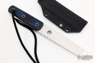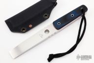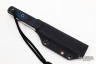 This Prybar (please let us know if you know who made this) has black/blue G-10 scales with red liners, full tapered tang construction. The pry bar is satin finished with notched finger rests, .386" blade stock and .954" blade depth. Includes a black kydex sheath. Excellent condition.