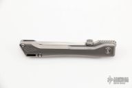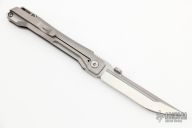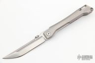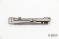 This Soldiers Pocket Knife by Darriel Caston features a satin tanto blade with notched thumbrest and thumbdisc. The handle has a milled and anodized titanium frame with matching tip up clip and backspacer. Rides on bearings, nice detent, lockup and blade seating. Comes with original box. New from maker. 088/180